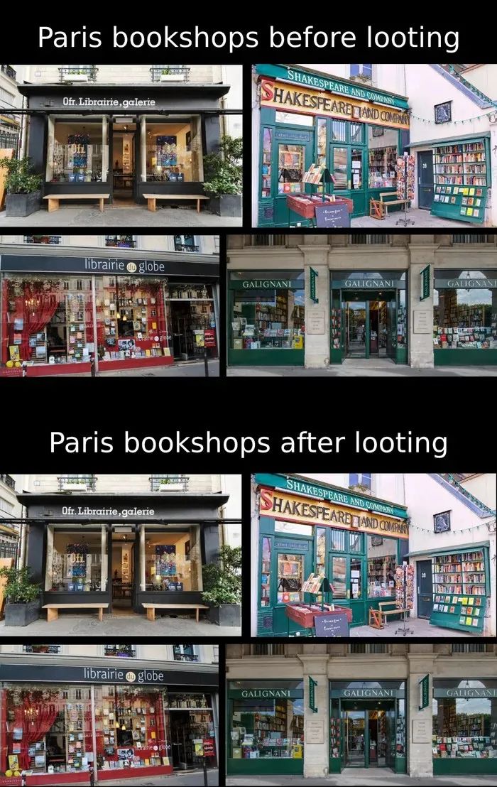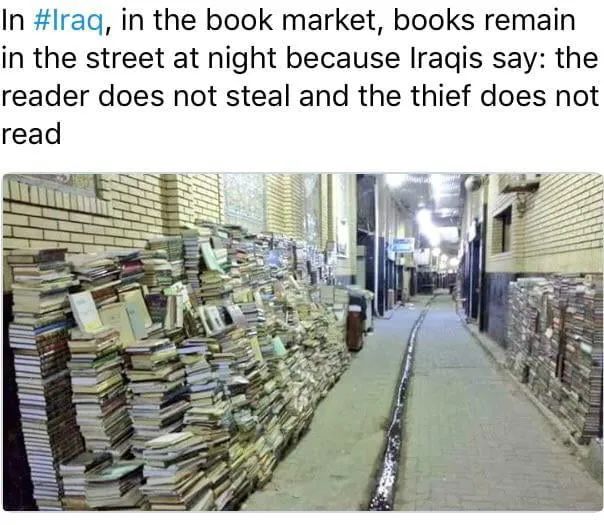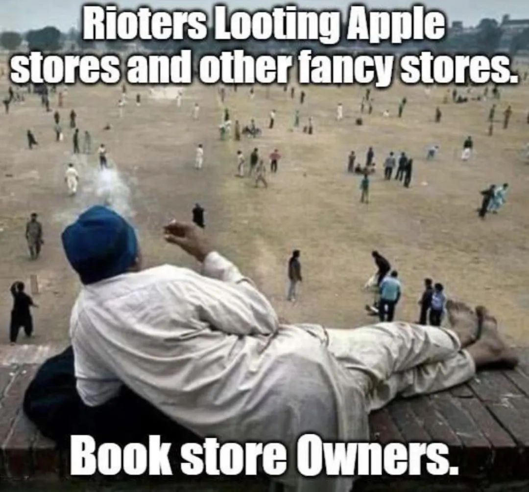 打劫可以不讲道理,但不可以不讲分寸。书店是所有人都默许不该被抢的地方。书不值钱,但书不该抢。就像做梦不赚钱,但你不能掐醒一个正在做梦的人。在全球各地的暴乱中,不抢书店,已经成为了某种约定俗成的文化默契。这是一种充满尊重的约定——书籍不是商品,它是我们最后的体面。正如一句伊拉克谚语所说:读者不偷,偷者不读。