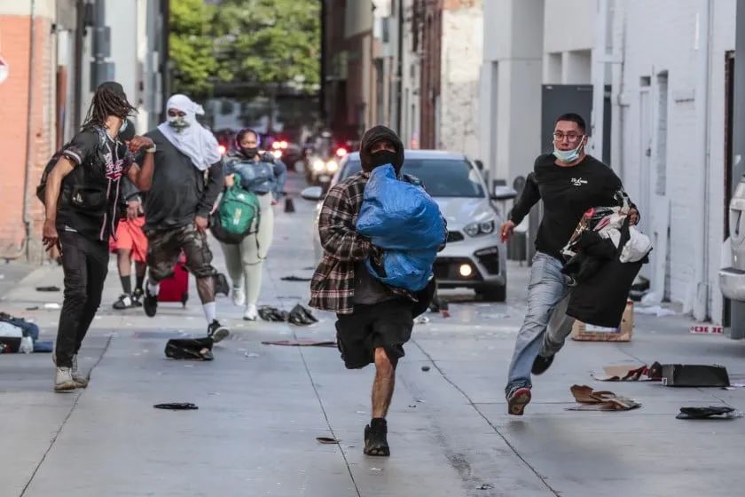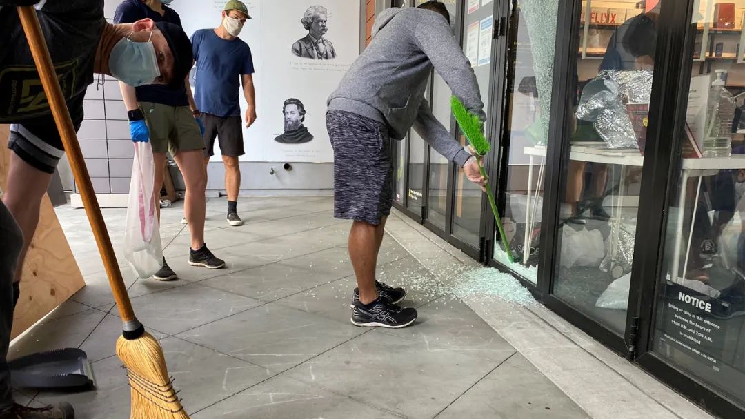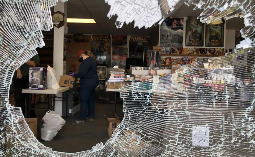 社会学家赫伯特·金顿在他着名的《商品羞耻》一书中写道:“人们不是在抢劫,他们在重新定义公正。”这句话第一次在BookMonster门口贴出来的时候,是2020年。当时附近的CVS药局被整个搬空。马路对面的Urban Outfitters连试衣镜都被搬走。