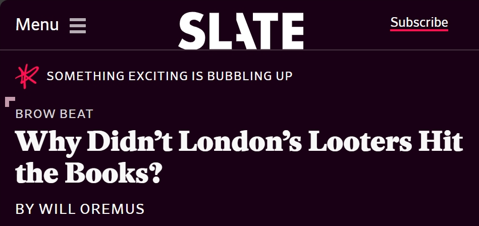 在得到回答之前,《赫芬顿邮报》又进一步提出了充满矛盾的新的问题:“这家书店之所以能活下来,是因为骚乱者尊重阅读,还是因为他们根本不关心书?”如果是因为前者,无疑会让那些想在骚乱中看到合法抗议核心精神的人感到振奋;而如果答案是后者,则会让那些喜欢把骚乱者看作是无脑白痴的人感到安心。