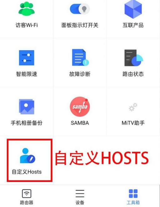 手机端的话Android修改hosts文件需要root权限,苹果的也比较麻烦,不过有个更好的思路,可以修改路由器的host,以小米路由器为例,在路由器的工具箱里找到“自定义hosts”。
