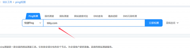 2.在地址栏里填上:t66y.com ,点击“立即检测”,可以看到国内的解析都是超时的,我们看下国外的