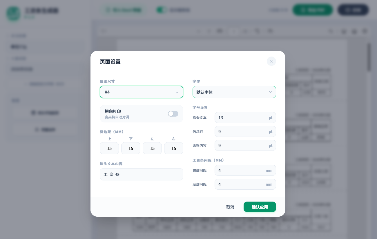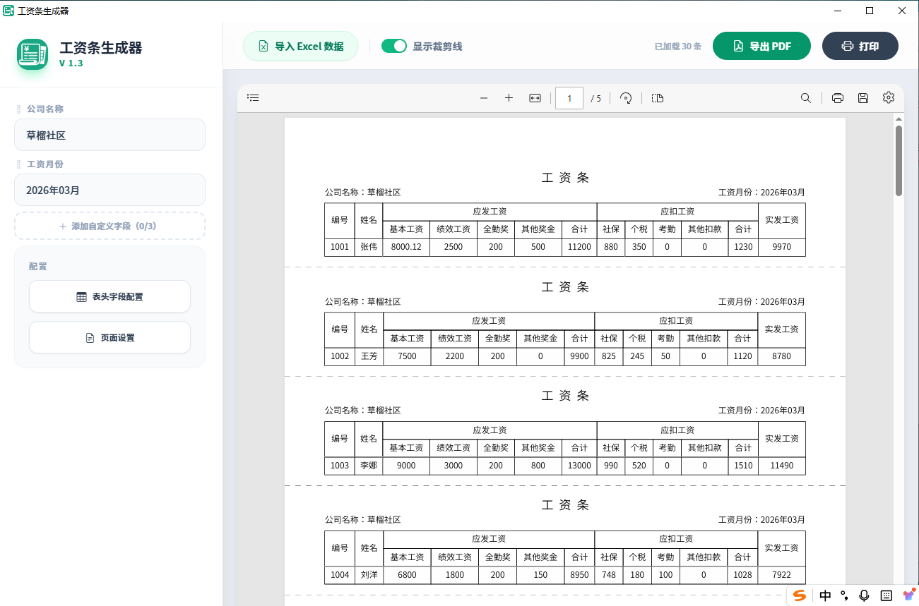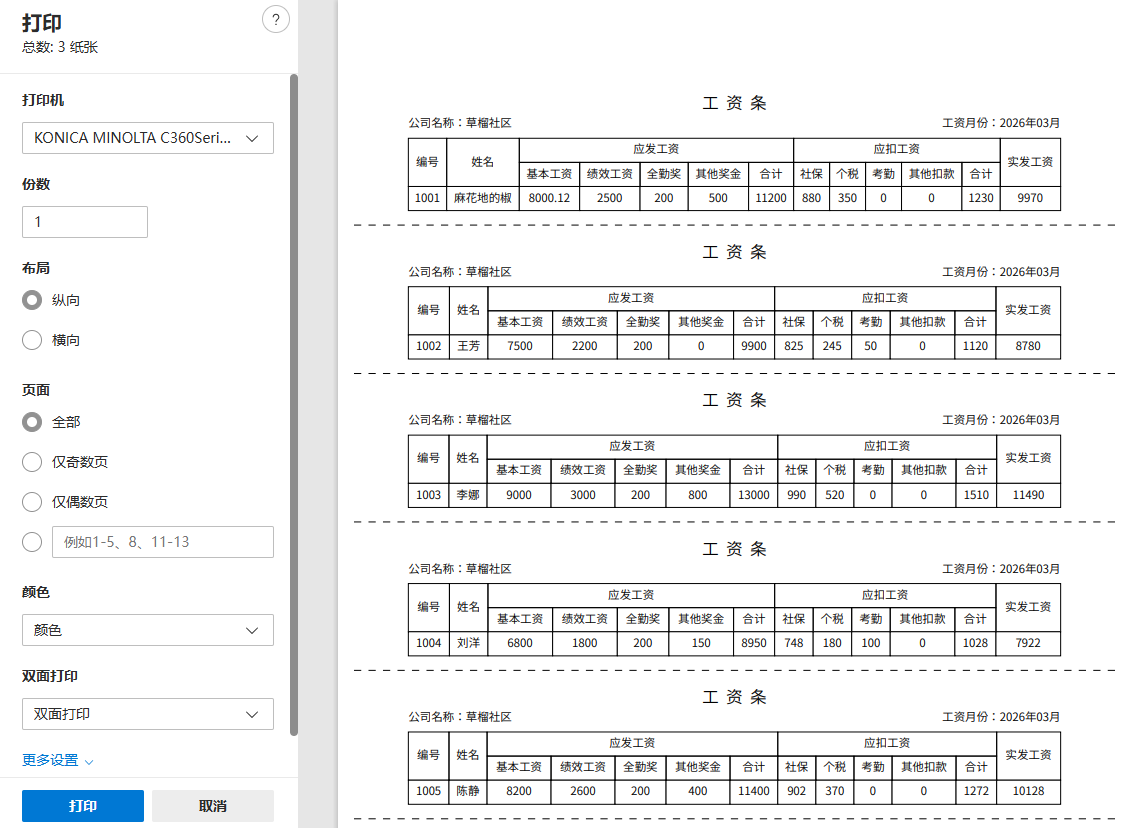 单页打印模式:支持“每人一页”或“连续打印”(同一页纸打印多条工资条,节省纸张)。